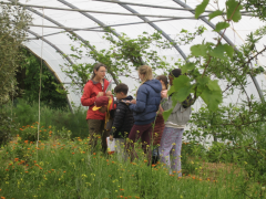 Ils y ont découvert le principe de la permaculture, l’effet de serre dans la serre à semis, l’intérêt de l’étagement de la végétation dans la lutte contre le réchauffement climatique ( autre serre ), la biodiversité et les relations entre espèces, le repos et l’enrichissement des sols sous bâche par décomposition de la matière organique, la biodiversité d’une mare, la notion de résilience de la nature et les effets bénéfiques des haies.