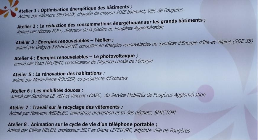 Après une présentation rapide des 17 ODD (Objectifs de Développement Durable), le rappel du rôle d’éco-délégués ainsi que les actions menées sur le territoire de Fougères en matière d’énergie et de développement durable, chaque élève a pu travailler sur 2 ateliers parmi les 8 proposés :
